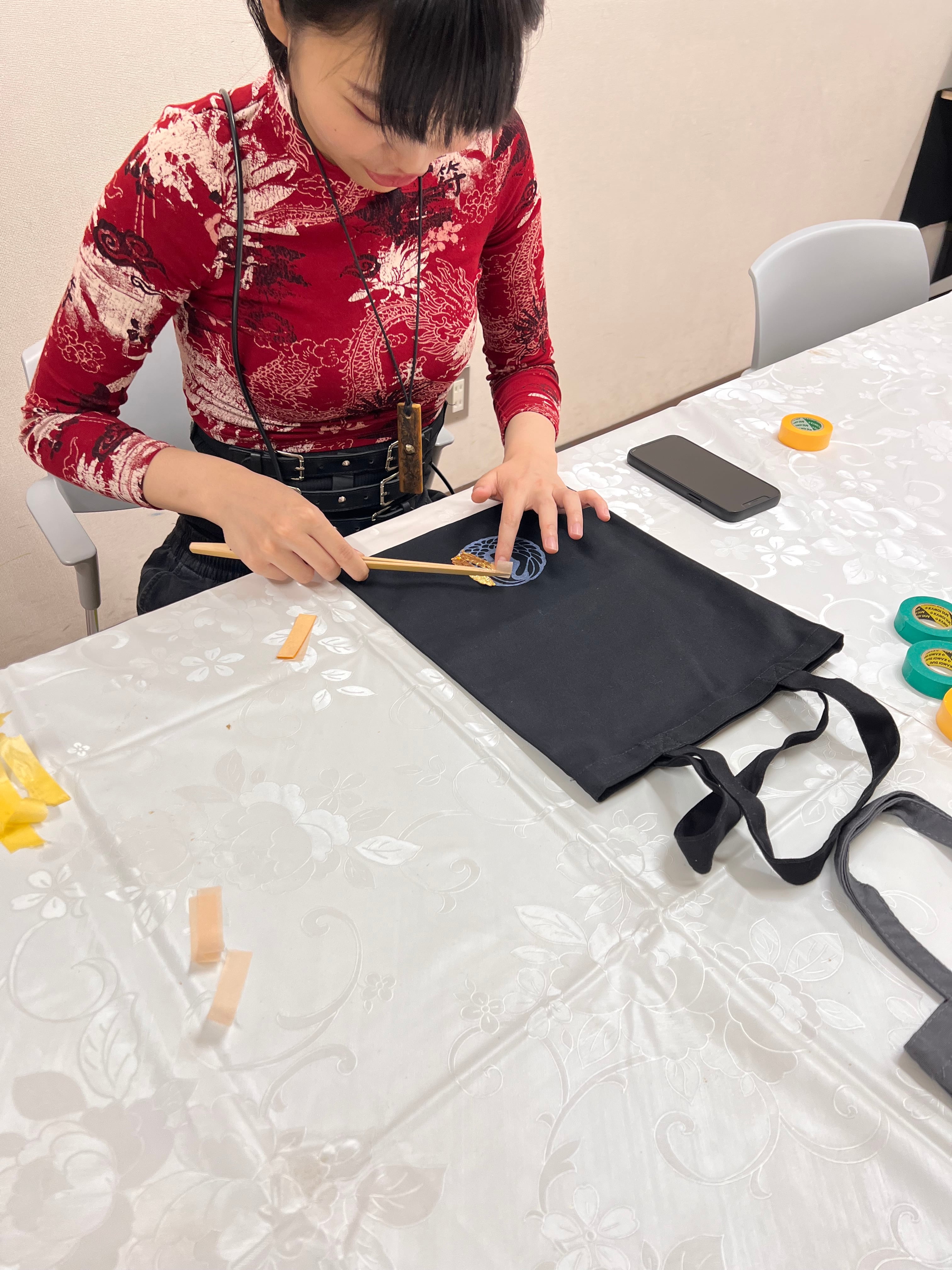 1万分の1ミリの薄い金箔を箔押し職人と同じ竹箸をつかって、ミニバッグもしくは、タンブラーに入れる和紙に金箔を貼る本格的な体験ができます。